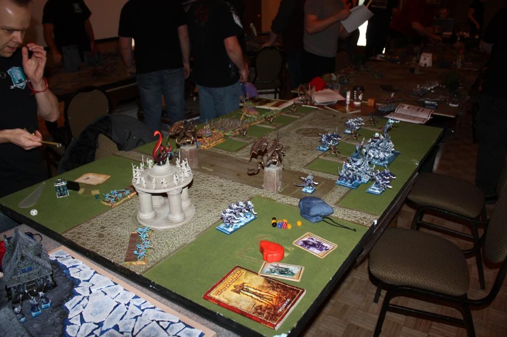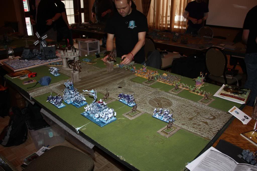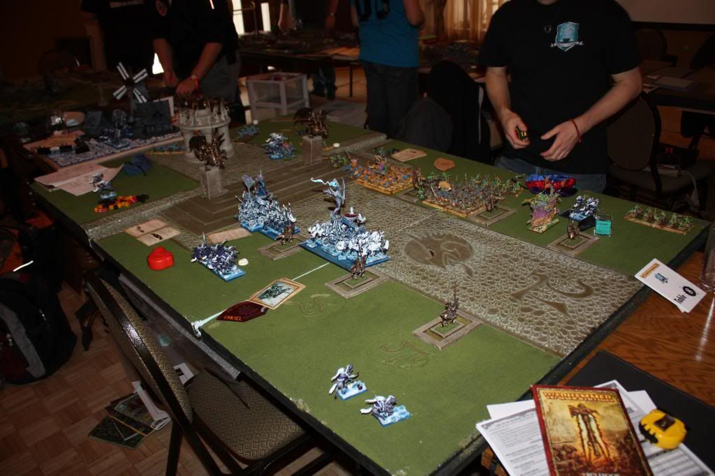 Game 1 vs Lizardmen (his army finished 3rd in painting... so very, very nicely painted army, and very colorful)