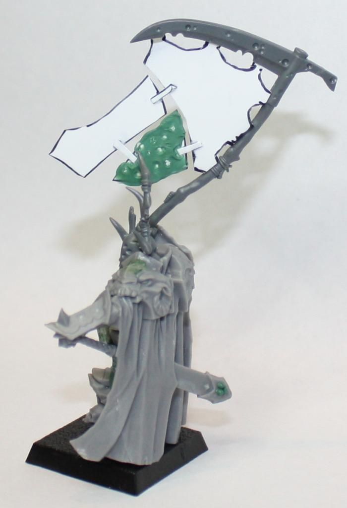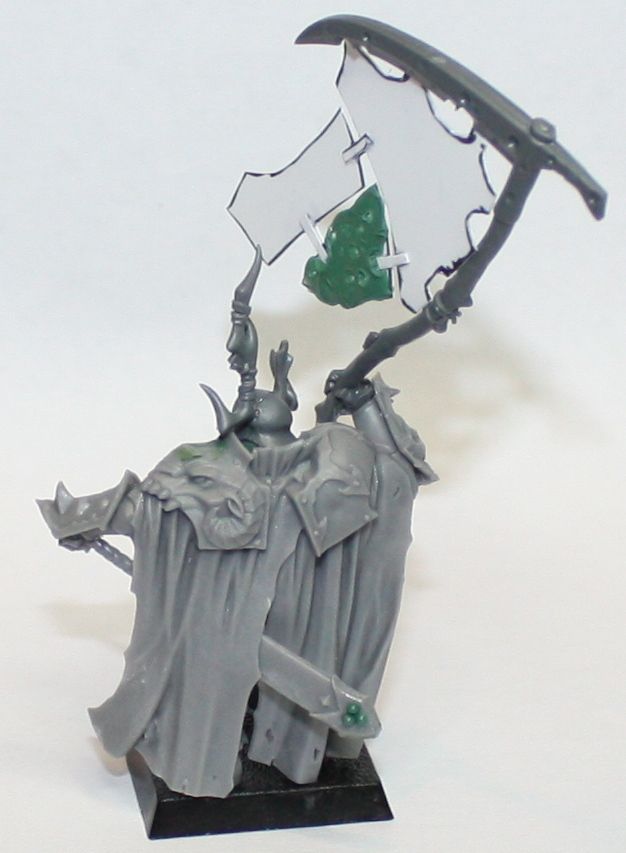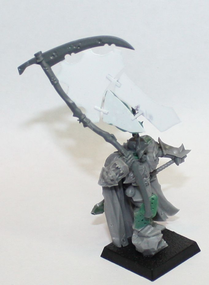 His right hands is holding a scythe, that is gonna be turned into a banner. At first i didnt like the idea, a weapon shouldnt be a banner as well, but it adds to his amazingness... sadly, beside him my Chaos Lord looks like a dwarf....